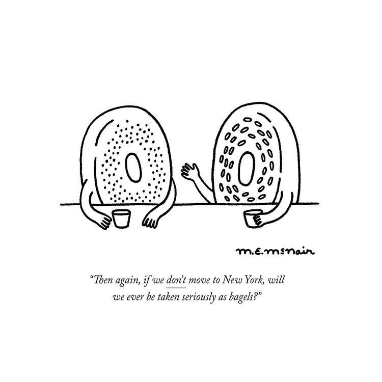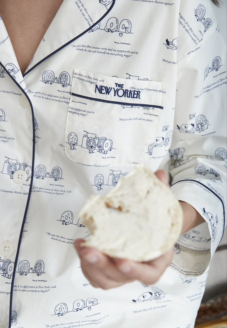 In honor of 100 years of The New Yorker, we’ve teamed up to create a collection of limited-edition pajamas featuring the whimsical work of cartoonist Elisabeth McNair. Whether or not you eat in bed, there’s nothing like time spent in bagel-themed pajamas.